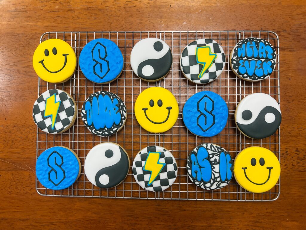 The smiley face has been living rent-free in my cookie ideas note for YEARS (okay like one year since I started the note). I keep a running list on my phone of designs I want to try and that smiley face just sits there, waiting for the right moment. Then I thought – what if I made the Cool S? And suddenly everything clicked: 90s notebook doodles!