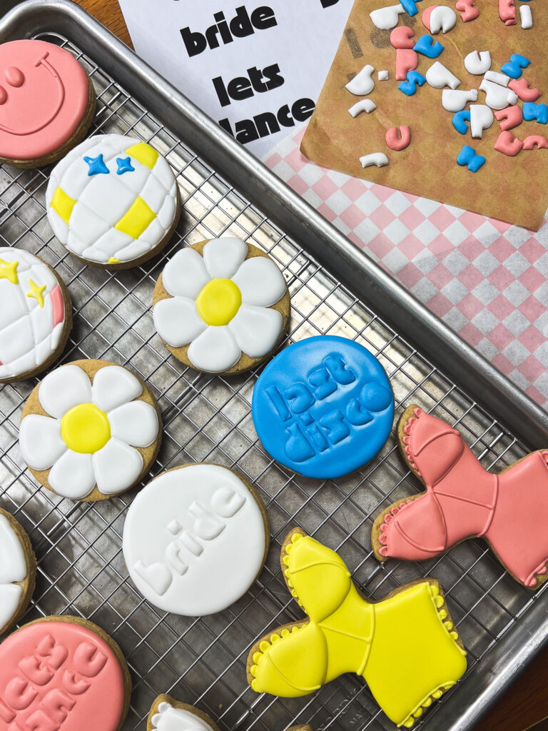 Here’s what I love about this collection – it’s versatile. Change “bride” to “let’s dance” or “last disco” (yes, I know “let’s” should have an apostrophe, but we’re not worrying about that on a cookie), and suddenly you’ve got party cookies for any celebration.