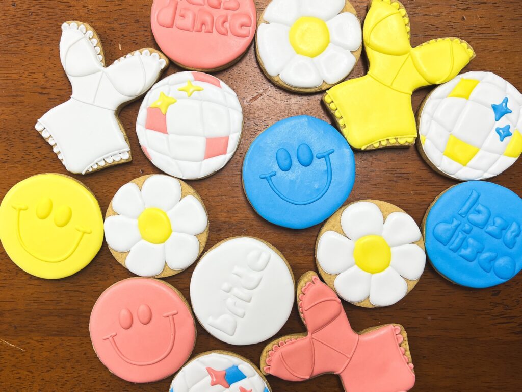 This set includes five designs: a monochrome smiley face, a disco ball, a daisy, the word “bride” (or other dancing phrases), and a corset cookie.